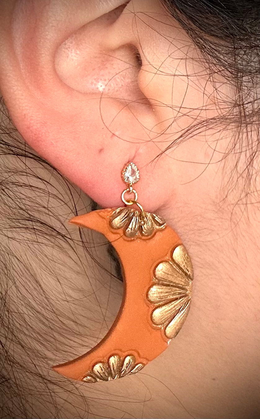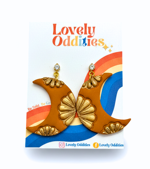 She’s got that warm terracotta vibe, dressed up with old-gold embossing for a touch of drama, plus 18k gold-plated findings sprinkled with just the right amount of bling. Think of her as a wearable talavera tile – playful, bold, and ready to pop.